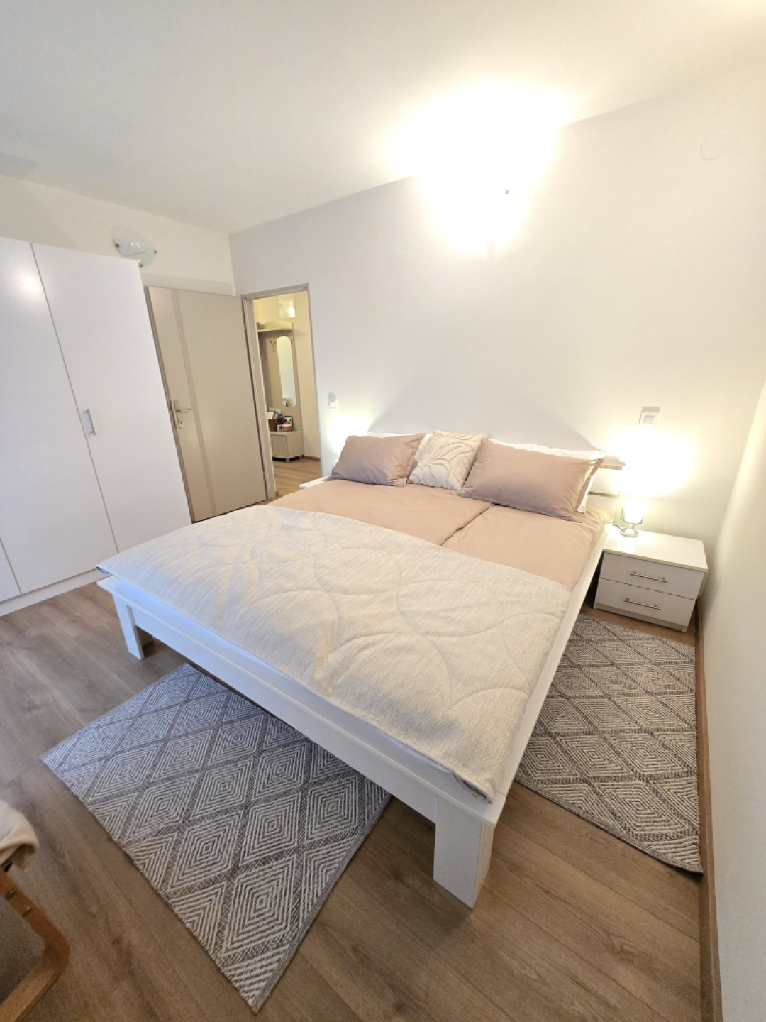 Apartman s 4 zvjezdice organiziran je kao modul s dvije spavaće sobe – jedna soba s bračnim krevetom za dvije osobe te druga soba s dva odvojena kreveta za po jednu osobu i dodatnim pomoćnim krevetom za dvije osobe, što omogućuje smještaj za ukupno 6 osoba. Prostor je prostran, funkcionalan i prilagođen obiteljima ili društvu prijatelja.
