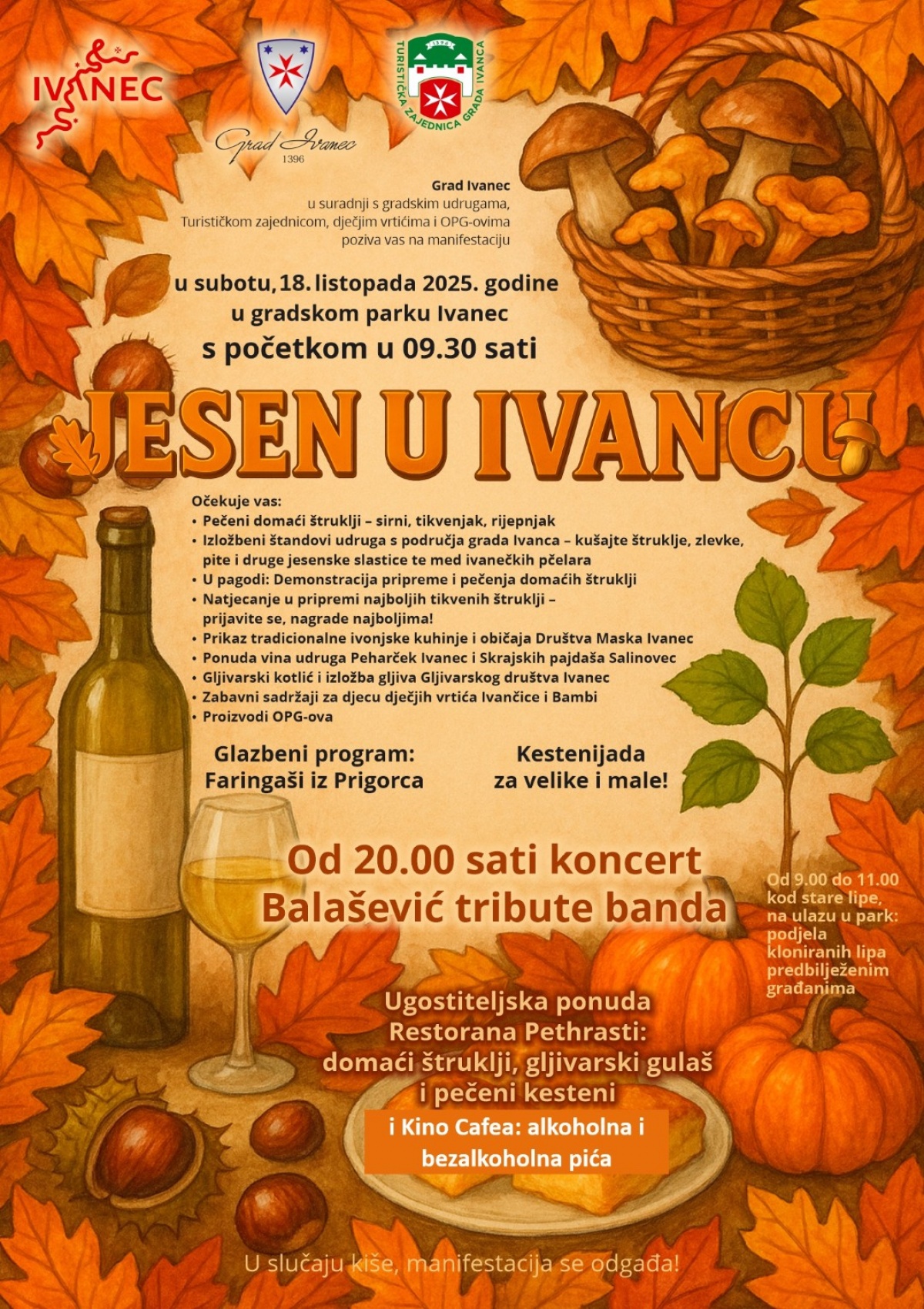 Nakon jutarnjeg programa ispunjenog glazbom, smijehom i dobrim vibracijama, pozivamo vas da nam se pridružite i u večernjem dijelu manifestacije Jesen u Ivancu s početkom u 20.00 sati.