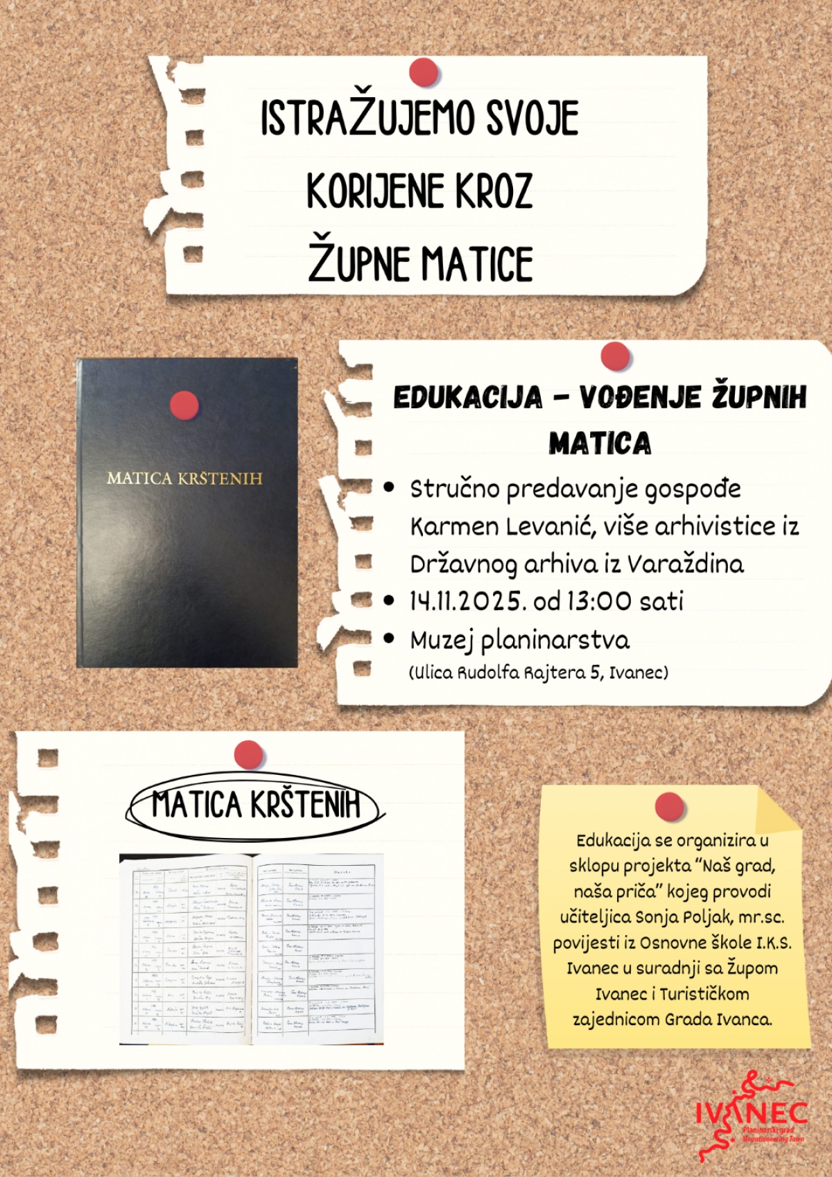 U petak, 14. studenoga 2025. godine, s početkom u 13:00 sati, u Muzeju planinarstva u Ivancu (Ulica Rudolfa Rajtera 5) održat će se stručna edukacija pod nazivom „Vođenje župnih matica“.