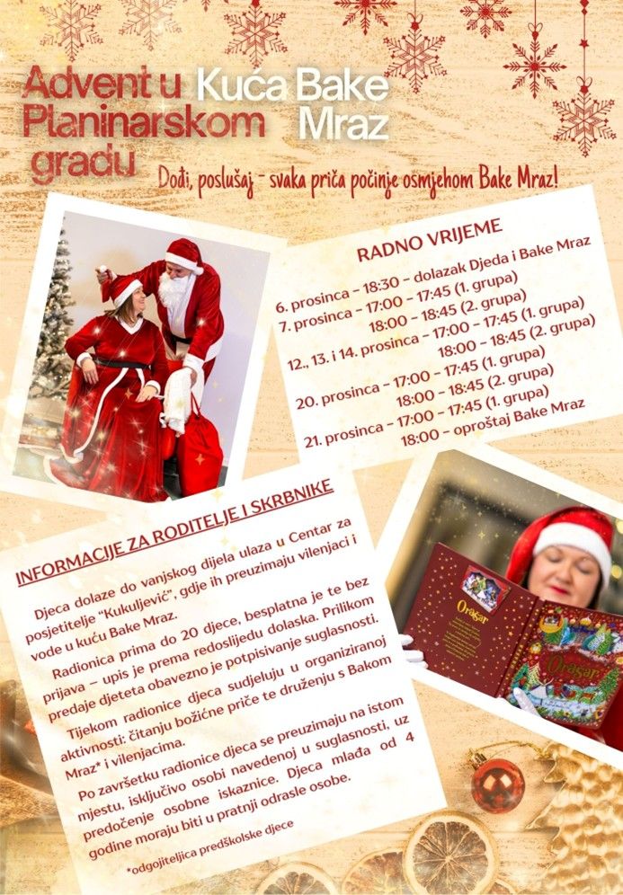 Centar za posjetitelje “Kukuljević” (Trg hrvatskih ivanovaca 4) ove godine po prvi puta u sklopu Adventa u Planinarskom gradu otvara vrata čarobne Kuće Bake Mraz, jedinstvenog blagdanskog kutka u kojem najmlađi mogu doživjeti toplinu božićnih priča, druženje s Bakom Mraz i vilenjacima te pravu prosinačku čaroliju.