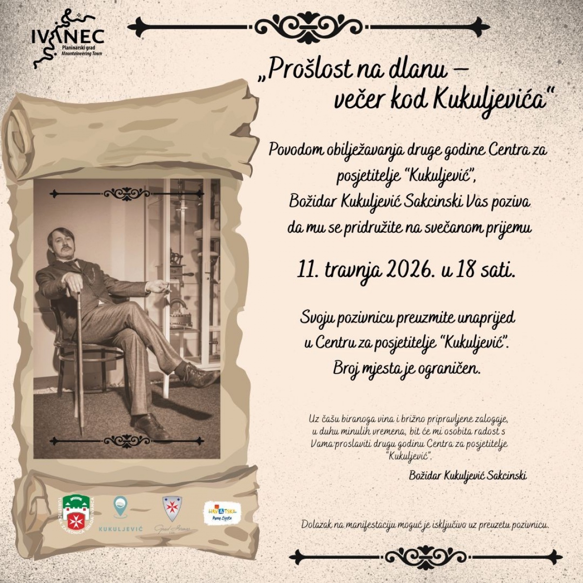 Povodom 2. godišnjice rada, na terasi Centar za posjetitelje „Kukuljević“ u Ivancu održat će se kulturno druženje pod nazivom „Prošlost na dlanu – Večer kod Kukuljevića“. Događaj je zamišljen kao putovanje u kraj 19. stoljeća, vrijeme djelovanja znamenitog ivanečkog pravnika, pjesnika i planinara Božidar Kukuljević Sakcinski, čiji duh i danas obilježava kulturni identitet grada.