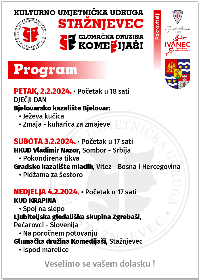 U subotu, s početkom u 17.00 sati, u Stažnjevcu gostuje Hrvatsko kulturno umjetničko društvo „Vladimir Nazor“ iz Sombora (Srbija) te Gradsko kazalište mladih iz Viteza (BiH).