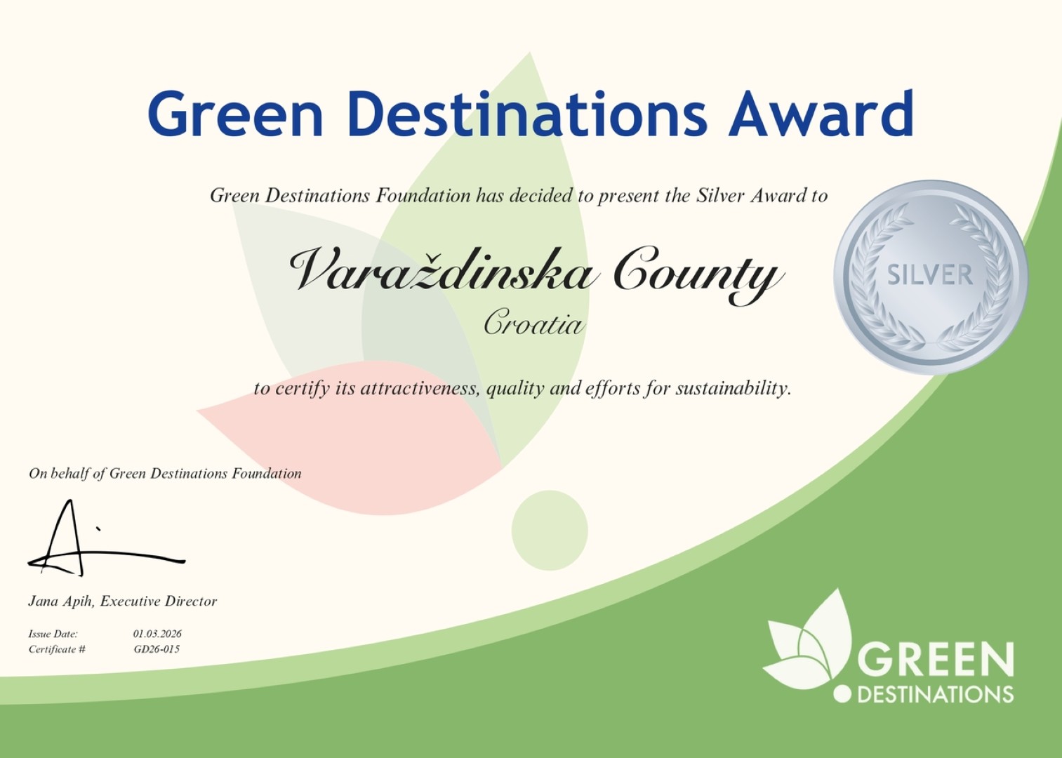 Ponosni smo što je Varaždinska županija proglašena Green Destinations regijom te joj je dodijeljena srebrna oznaka Green Destination, što predstavlja veliko međunarodno priznanje za dugogodišnji rad na razvoju održivog turizma. Priznanje je uručeno na najvećem svjetskom turističkom sajmu, ITB Berlin u Berlin, gdje su ga preuzeli župan Anđelko Stričak i direktor Turističke zajednice Varaždinske županije Goran Mališ.