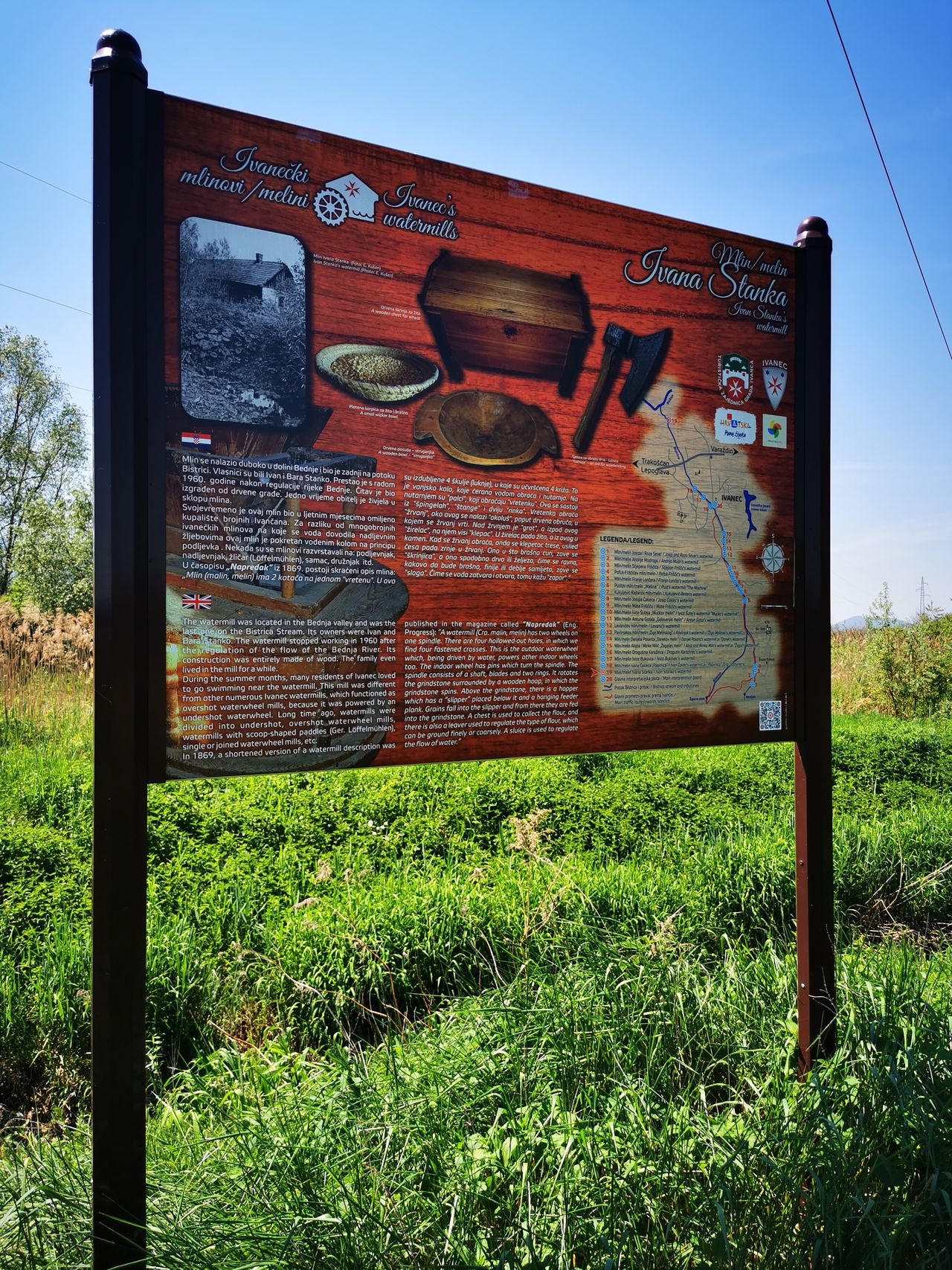U časopisu „Napredak“ iz 1869. postoji skraćeni opis mlina: „Mlin (malin, melin) ima 2 kotača na jednom "vretenu". U ovo su izdubljene 4 škulje (luknje), u koje su učvršćena 4 križa. To je vanjsko kolo, koje ćerano vodom obraća i nutarnja. Na nutarnjem su "palci", koji obraćaju "vretenku". Ova se sastoji iz "špingelah", "štange" i dviju "rinka". Vretenka obraća "žrvanj", oko ovog se nalazi "okoluš", poput drvena obruča, u kojem se žrvanj vrti. Nad žrvnjem je "grot", a izpod ovog "žirelac", na njem visi "klepac". U žirelac pada žito, a iz ovog u kamen. Kad se žrvanj obraća, onda se klepetac trese, uslied česa pada zrnje u žrvanj.